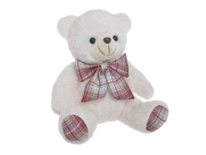 AKCE: Sedící plyšový medvídek bílý s kostkovanou mašlí. Materiál: textil + filc + úplet Rozměry: 20cmLx18cmWx20cmH