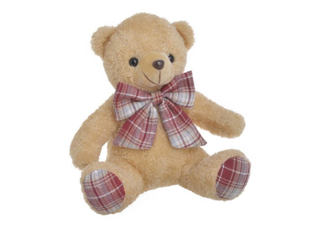 Sedící plyšový medvídek s kostkovanou mašlí.
