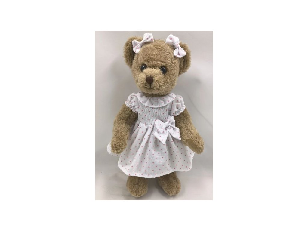 Plyšová medvědice v bílých puntíkatých šatičkách s mašličkami, 30cm. Elegantní plyšový medvěd od renomované belgické značky La Galleria. Luxusní a stylový doplněk. Medvěd je vyroben z hebkého plyše nejvyšší kvality, příjemného na dotek, a jeho outfit vyniká jemnými detaily a precizním zpracováním, což ho dělá ideálním pro sběratele i jako dárek pro milovníky stylových plyšáků. Velikost 30cm.