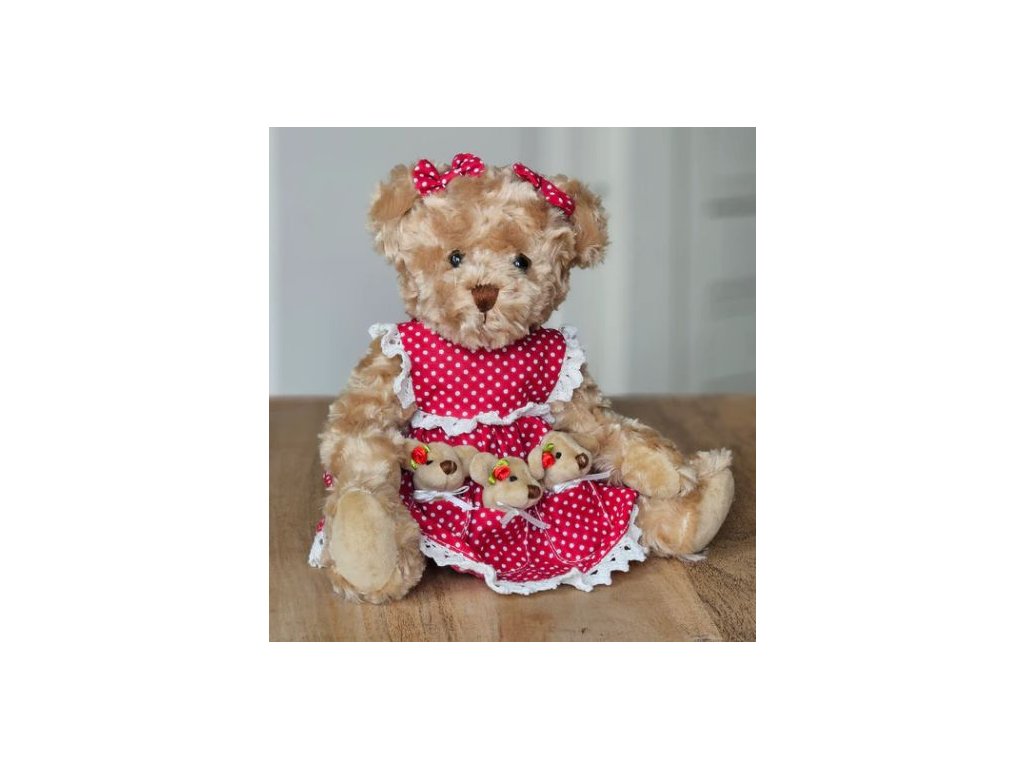 Plyšový medvídek v červených puntíkatých šatičkách s mašličkami a medvíďaty v kapsičkách La Galleria. Elegantní plyšový medvěd od renomované belgické značky La Galleria. Luxusní a stylový doplněk. Medvěd je vyroben z hebkého plyše nejvyšší kvality, příjemného na dotek, a jeho outfit vyniká jemnými detaily a precizním zpracováním, což ho dělá ideálním pro sběratele i jako dárek pro milovníky stylových plyšáků. Velikost 30 cm.