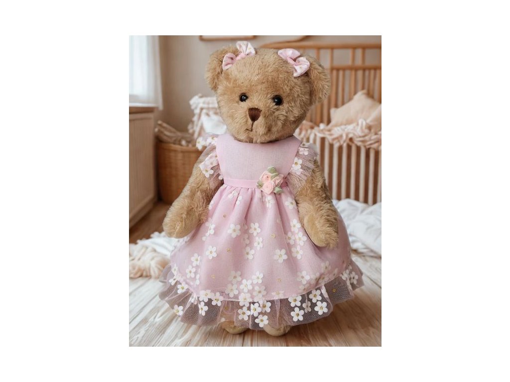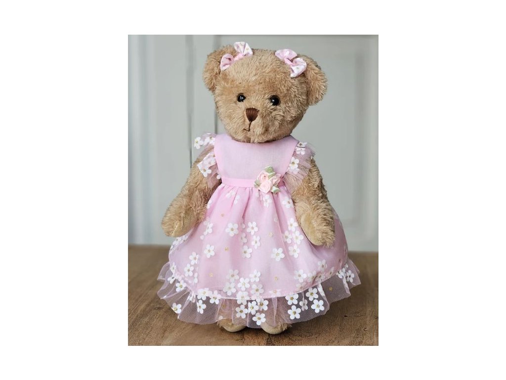 Plyšová medvědice v růžových šatičkách s kytkami, 30cm. Elegantní plyšový medvěd od renomované belgické značky La Galleria. Luxusní a stylový doplněk. Medvěd je vyroben z hebkého plyše nejvyšší kvality, příjemného na dotek, a jeho outfit vyniká jemnými detaily a precizním zpracováním, což ho dělá ideálním pro sběratele i jako dárek pro milovníky stylových plyšáků. Velikost 30cm.