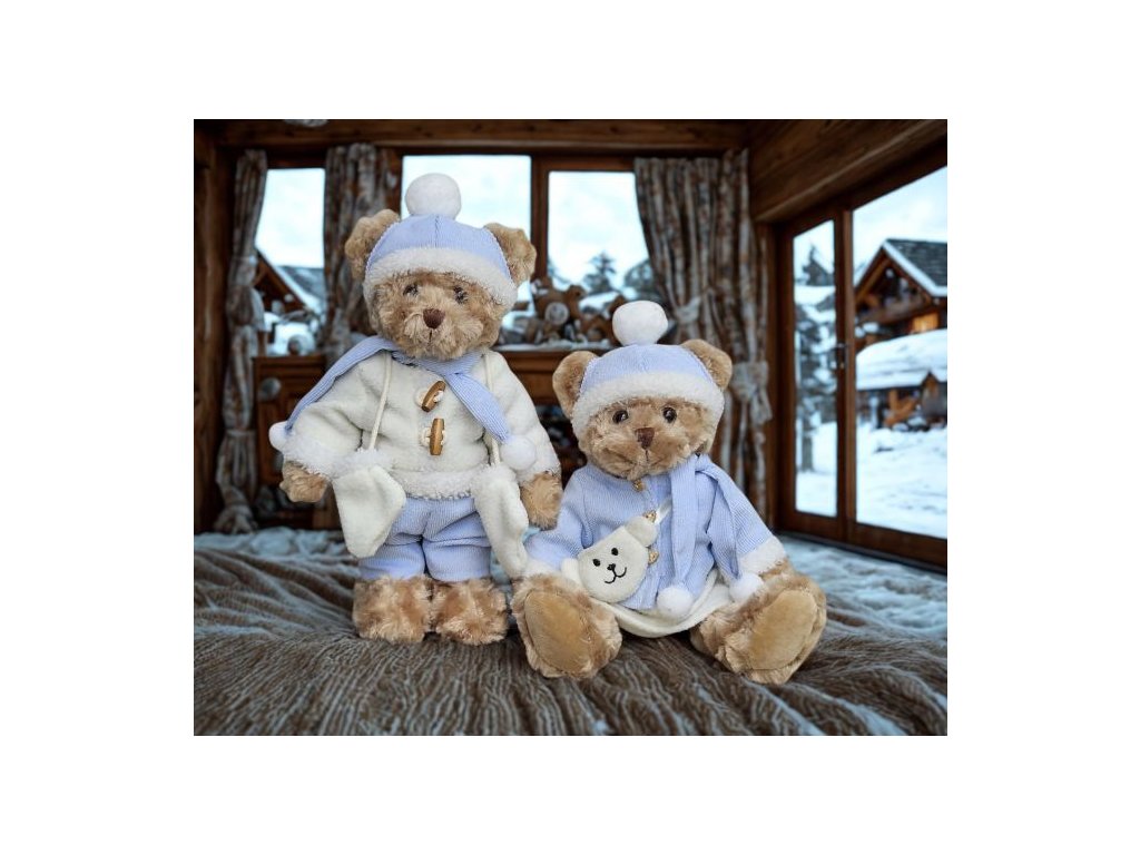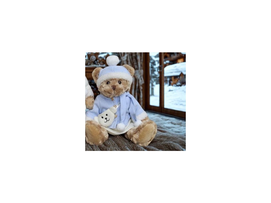 Plyšová medvědice ve světle-modrém zimním outfitu, 30cm.