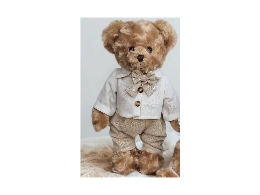 Plyšový medvěd v béžovém lněném outfitu, 30cm. Elegantní plyšový medvěd od renomované belgické značky La Galleria. Luxusní a stylový doplněk. Medvěd je vyroben z hebkého plyše nejvyšší kvality, příjemného na dotek, a jeho outfit vyniká jemnými detaily a precizním zpracováním, což ho dělá ideálním pro sběratele i jako dárek pro milovníky stylových plyšáků. Velikost 30cm.