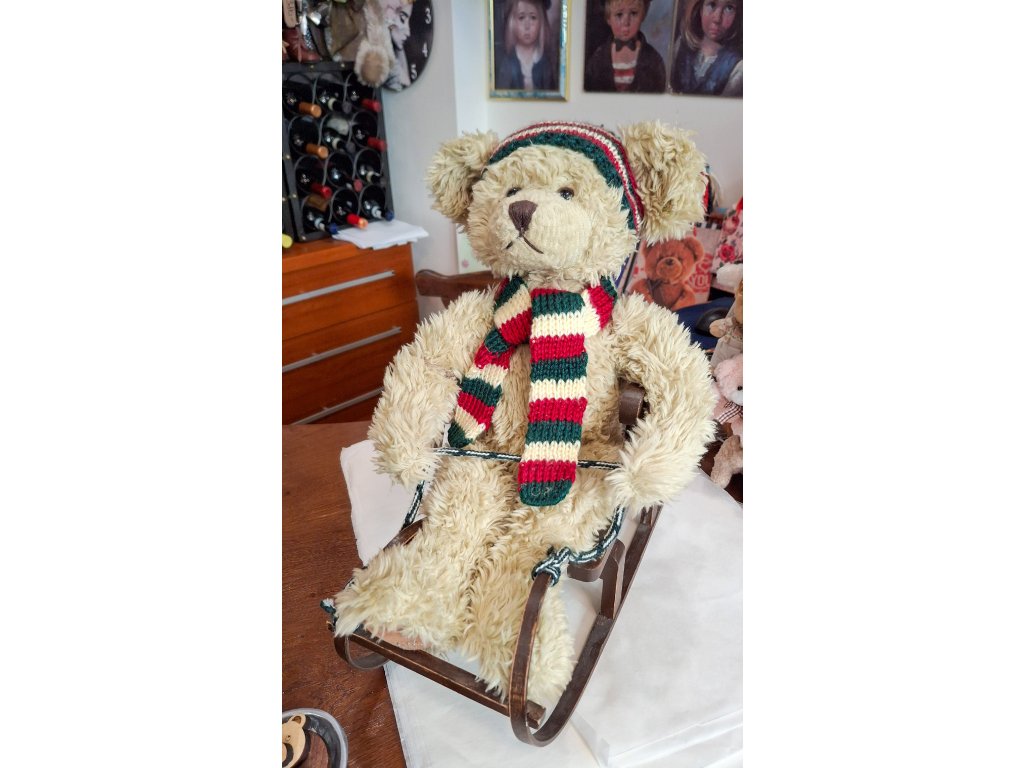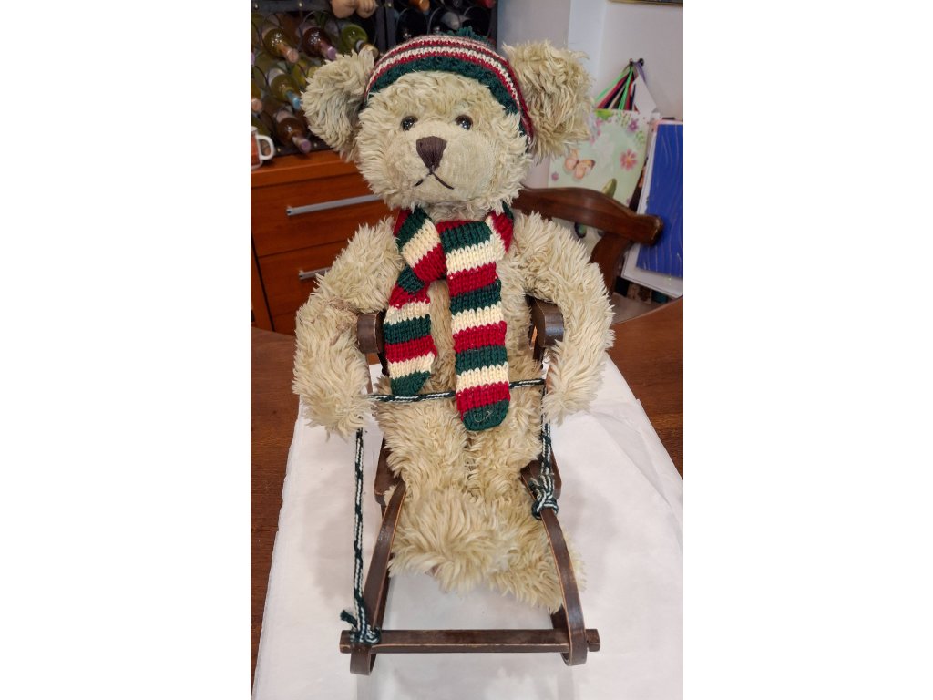 Plyšový medvěd s šálou a čepicí na starých dřevěných saních.