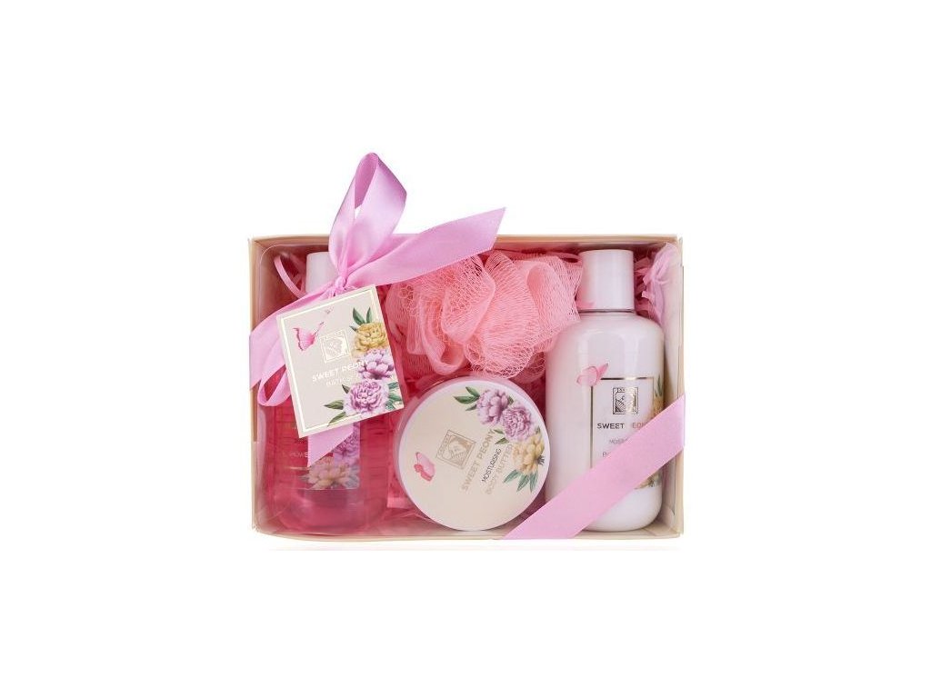 Obsah: 180ml gel sprchový , 180ml mléko tělové, 60ml máslo tělové, 10g houba síťovaná, vůně: sladká pivoňka
