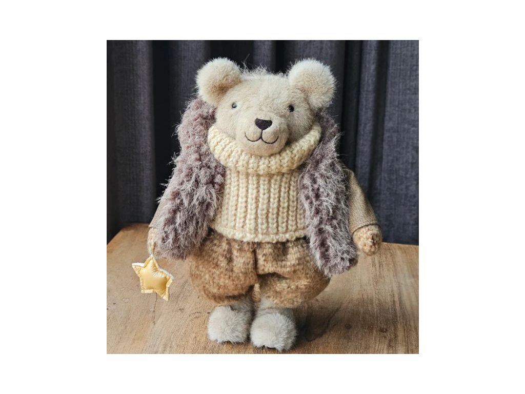 Stojící medvídek v zimním kožíšku, 33cm. Elegantní plyšový medvěd od renomované belgické značky La Galleria. Luxusní a stylový doplněk. Medvěd je vyroben z hebkého plyše nejvyšší kvality, příjemného na dotek, a jeho outfit vyniká jemnými detaily a precizním zpracováním, což ho dělá ideálním pro sběratele i jako dárek pro milovníky stylových plyšáků. Velikost 33cm.