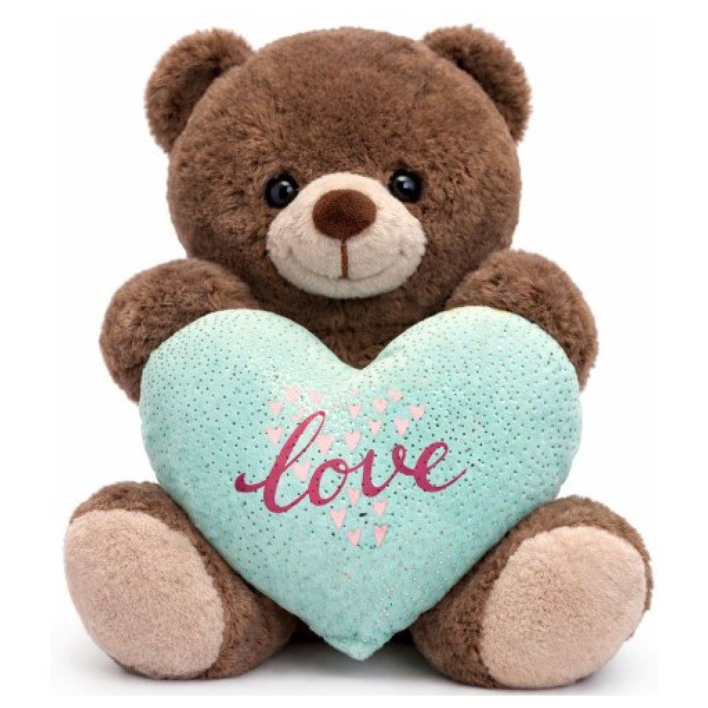 Tmavě hnědý medvídek se zelenkavým srdíčkem, 25cm